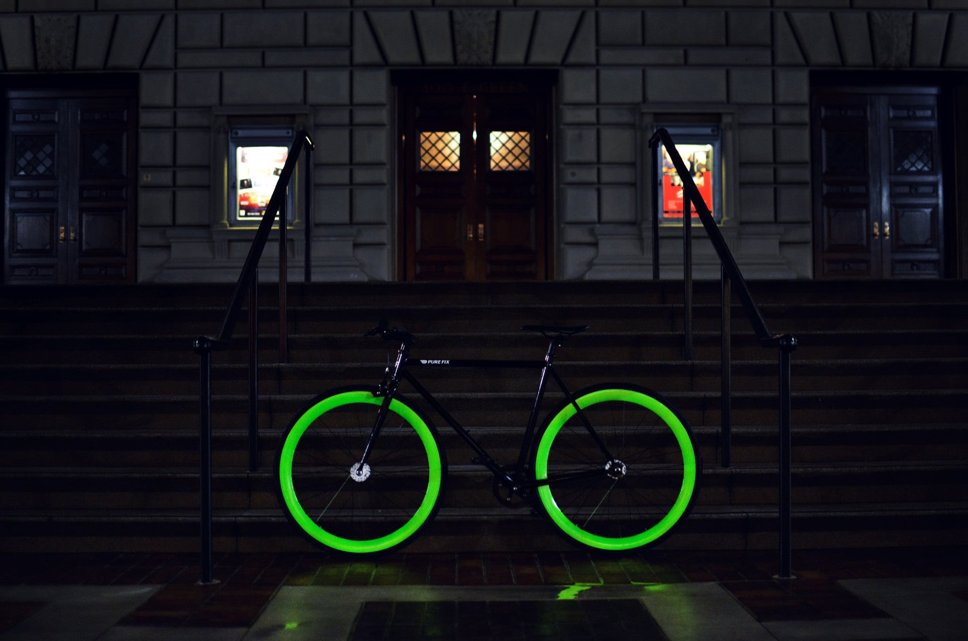 With a black frame and green wheels that shine into the night, you'll look as good as glow! Get ready to take your night riding to a whole new level. After months of experimentation, we've perfected the GLOW, our newest line. The name says it all, it actually glows. The paint is solar-activated, so just give your bike an hour of daytime sun for an hour plus of night-time fun. Whether you're a night owl, a raver, or just want to trip out your friends, this is the bike for you.