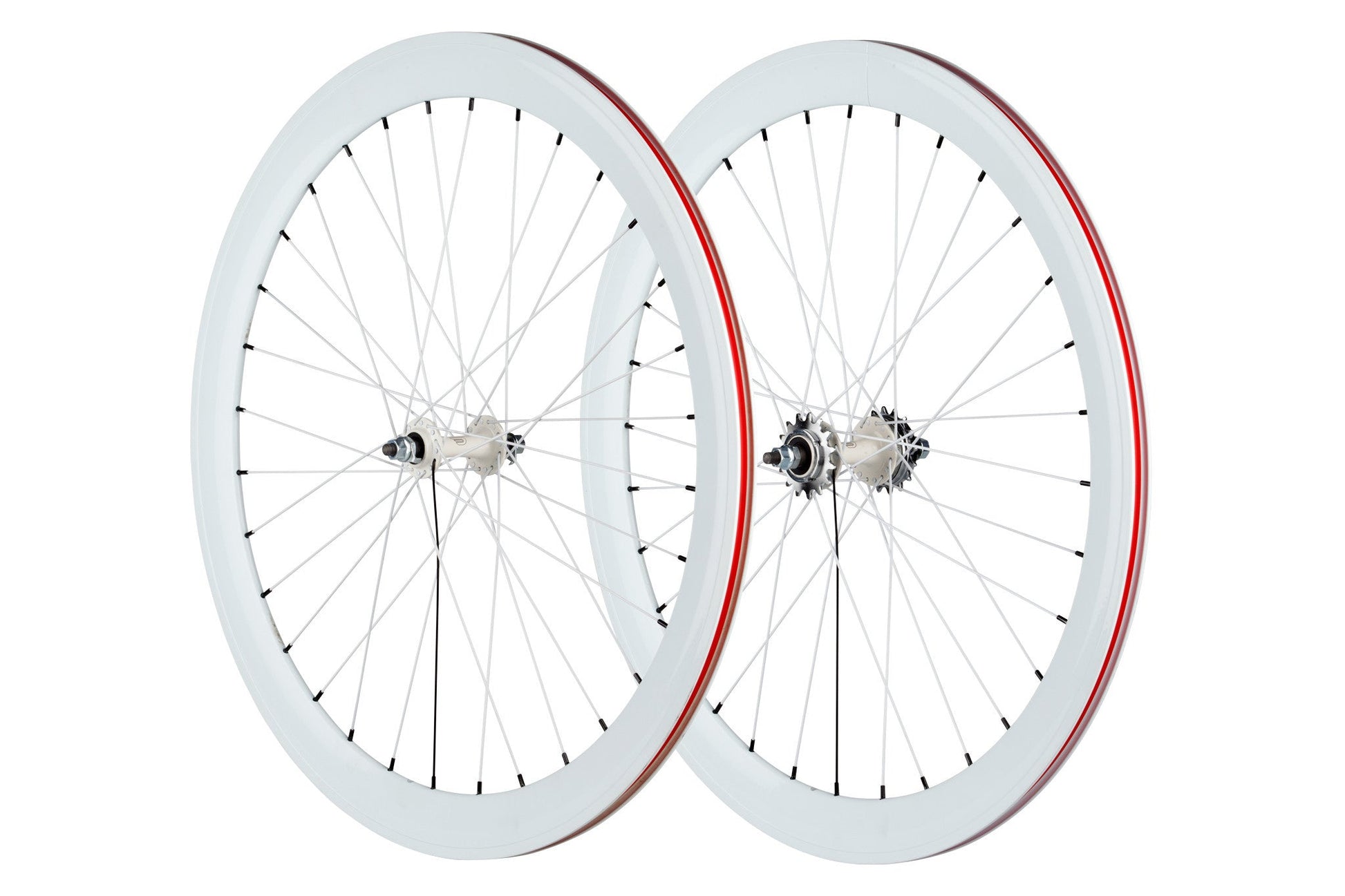 Pure Fix double-walled aluminum wheelsets are size 700C with a 50mm rim depth, front and rear. Our wheels include name-brand and laser-etched KT Quando hubs (100mm front, 120mm rear, 3/8" axle). Our rear wheels include flip-flop hubs with a pre-attached 16T fixed cog along with a 16T freewheel cog for single-speed riding. Our front and rear wheels are 32 spokes each. All wheelsets include nylon rim-strips to protect against sharp edges and prevent tube puncture.